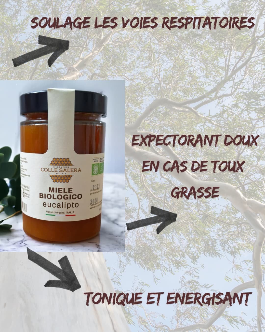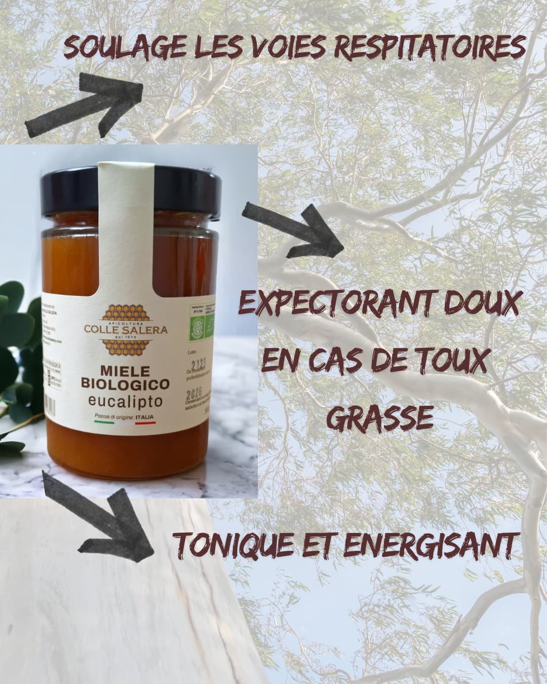 🌿 Le miel d’eucalyptus est reconnu pour ses vertus naturelles sur l’appareil respiratoire. Riche en composés aux propriétés antiseptiques, antimicrobiennes et anti-inflammatoires, il est particulièrement recommandé pour soulager les toux, rhumes, bronchites légères et apaiser les irritations de la gorge.