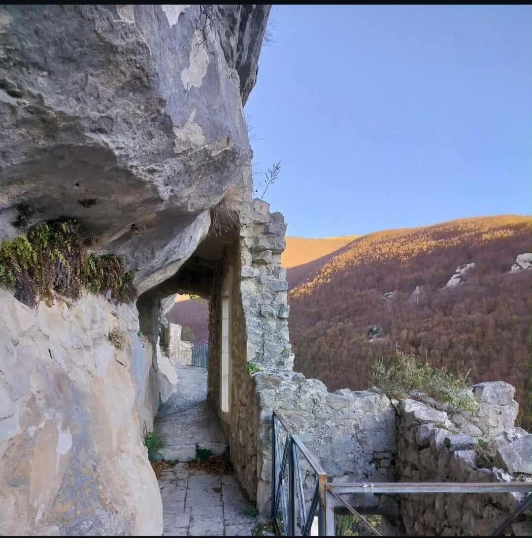 Depuis Roccamorice, un sentier serpente à travers forêts, roches et gorges calcaires, avant d’atteindre ce refuge taillé dans la pierre, suspendu au-dessus du vide.